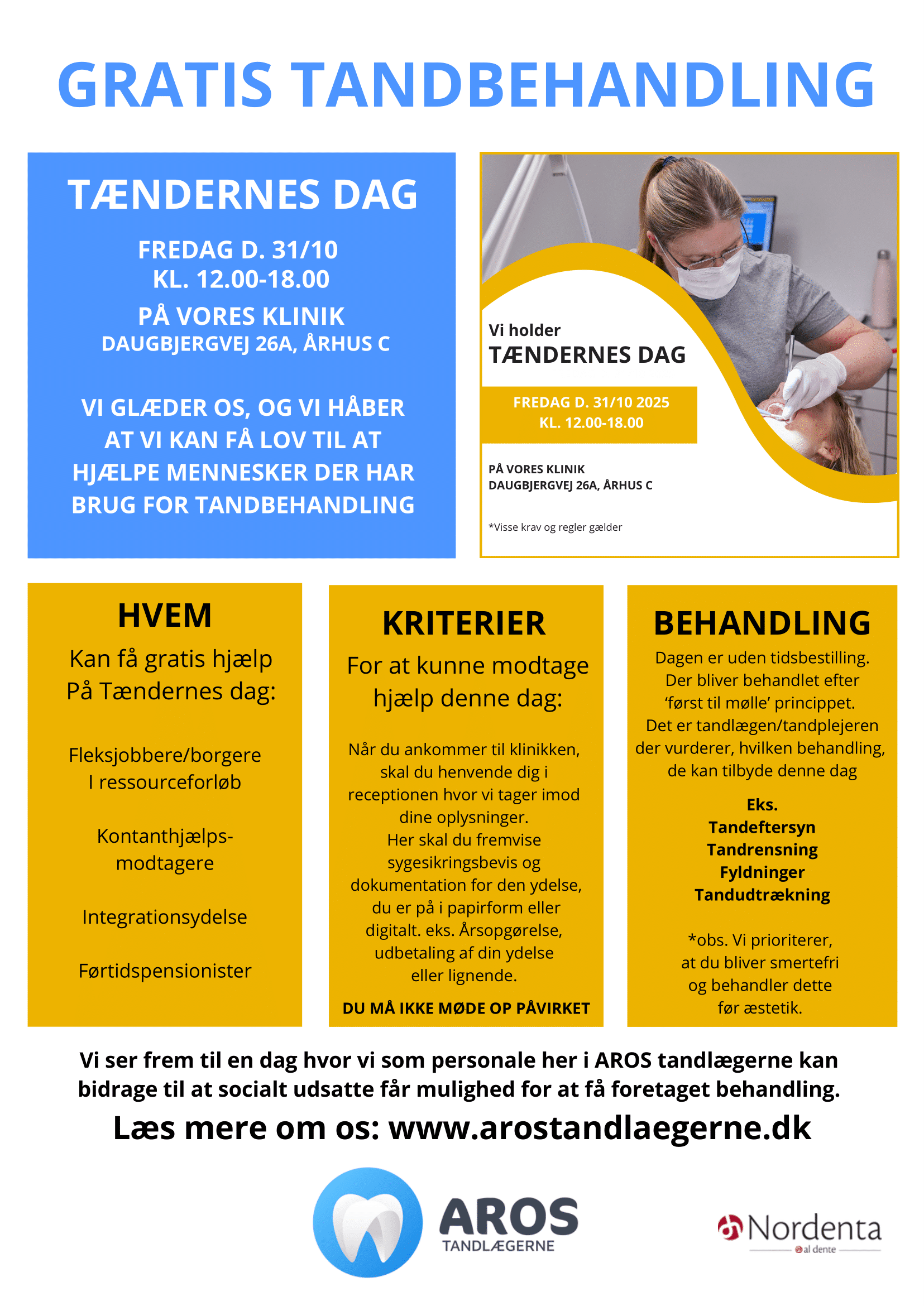 Hos AROS Tandlægerne i Aarhus C, centralt beliggende på Daugbjergvej 26, tilbyder vi professionel tandpleje med fokus på tryghed, kvalitet og personlig service. Som din lokale tandlæge i Aarhus udfører vi alt fra rutinetjek og tandrensning til kosmetiske løsninger som implantater, tandregulering og smile makeovers.